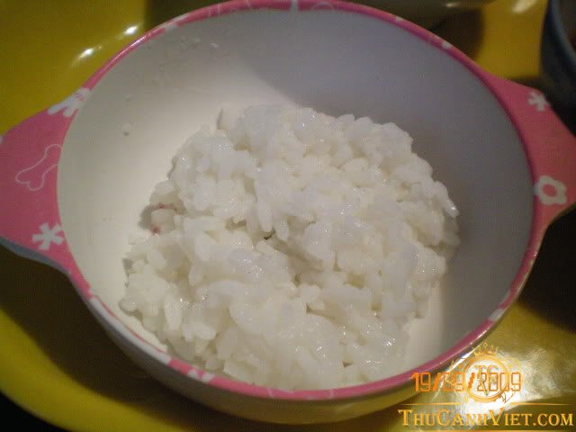 Từ 4 tháng tuổi, cơm có thể hơi khô hơn một chút, nhưng vẫn cắt nhỏ thức ăn trộn đều để tránh thiếu chất. Nhớ tránh cơm thiu, mốc nhé, dễ làm bé đau bụng.