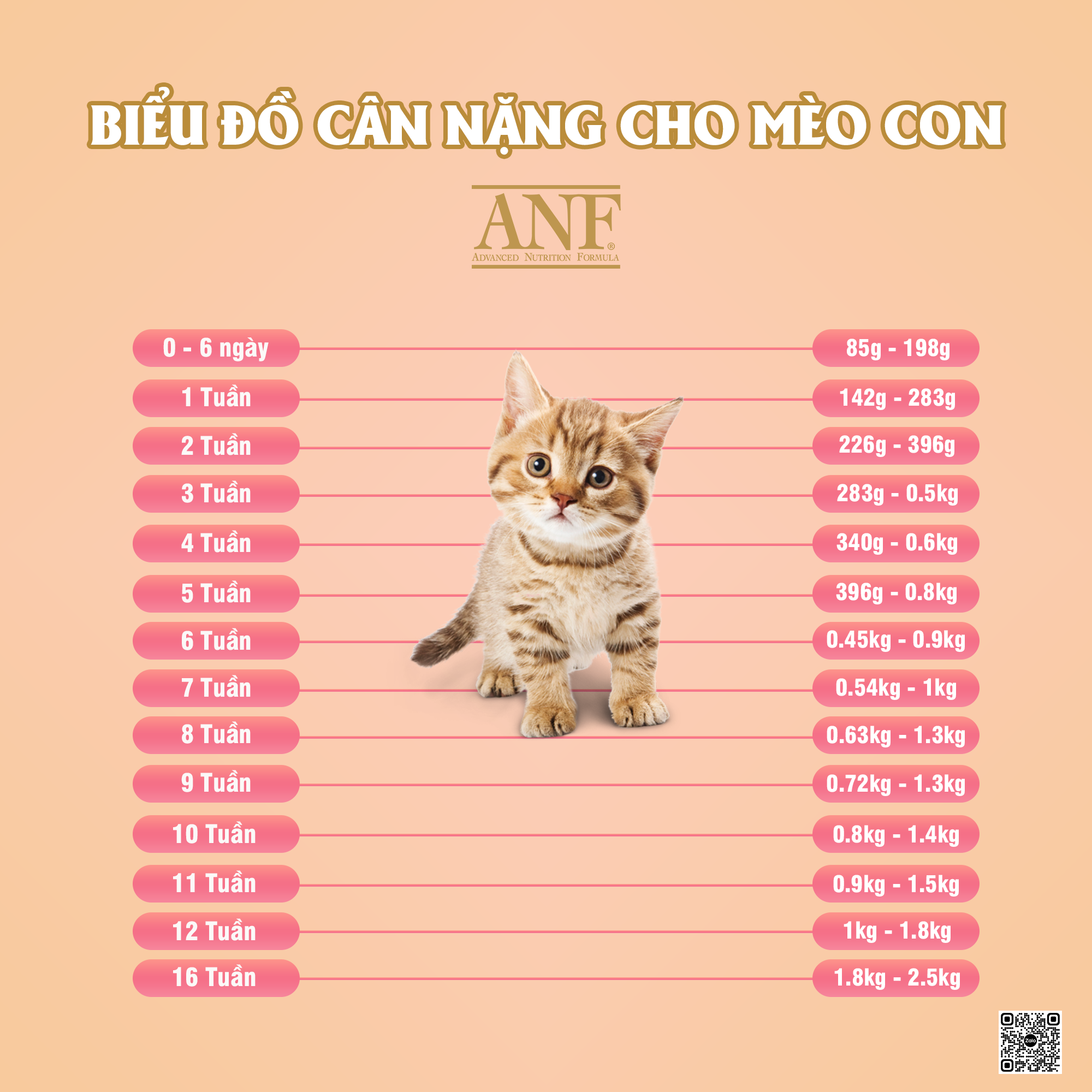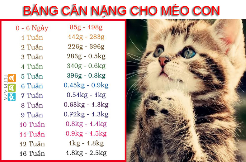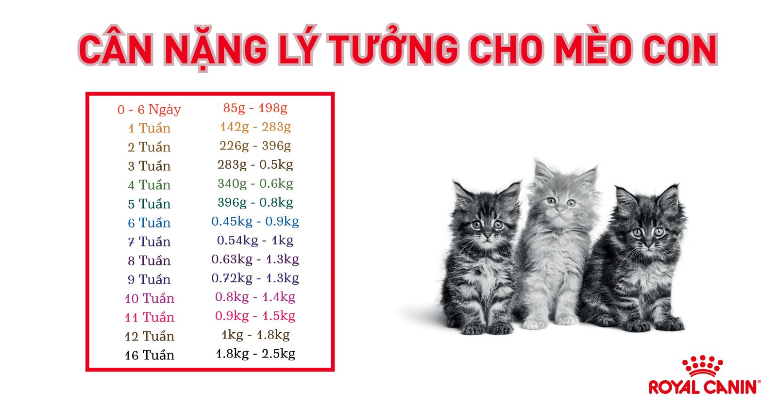 Từ lúc mới sinh, mèo con chỉ nặng chừng 80-150g, rồi tăng nhanh chóng: tháng đầu khoảng 110g, 2 tháng đạt 300-500g, đến 6 tháng thì tầm 2.5-3kg. Sau đó, tốc độ tăng chậm lại, ổn định ở mức 4kg khi 1 tuổi. Nhưng nếu là mèo Anh lông ngắn, chúng có thể lên đến 4-8kg khi 2-3 tuổi, trông mũm mĩm dễ thương lắm.