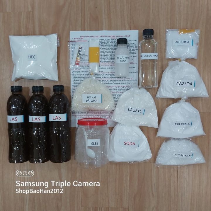 Muốn thơm tho hơn, thử công thức soda: Đun sôi 1,5 lít nước, tắt bếp cho 200g soda và hàn the khuấy tan, thêm 2,5 lít nước, 200ml xà bông thực vật lỏng và 15 giọt tinh dầu. Trộn 5 phút, để nguội dùng dần.