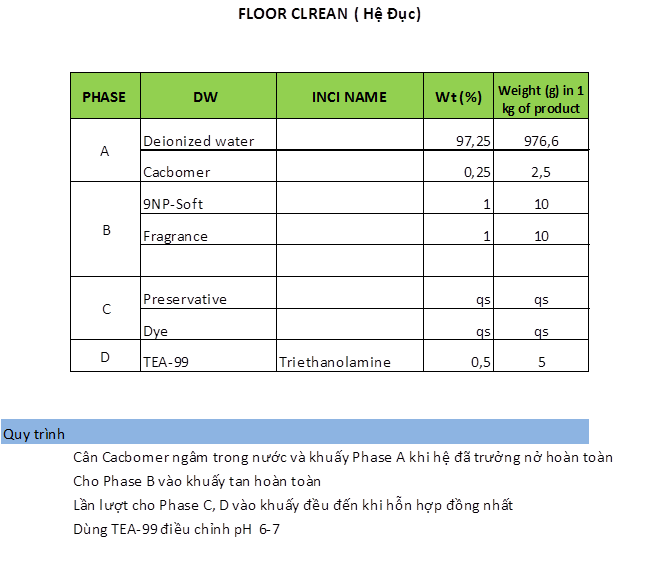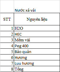 Ngoài ra, còn có axit citric (0.2%), chất tẩy quang học (0.25%), hương liệu, chất bảo quản và nước làm nền (hầu hết 100%), cùng trietanolamin chỉnh pH để an toàn.