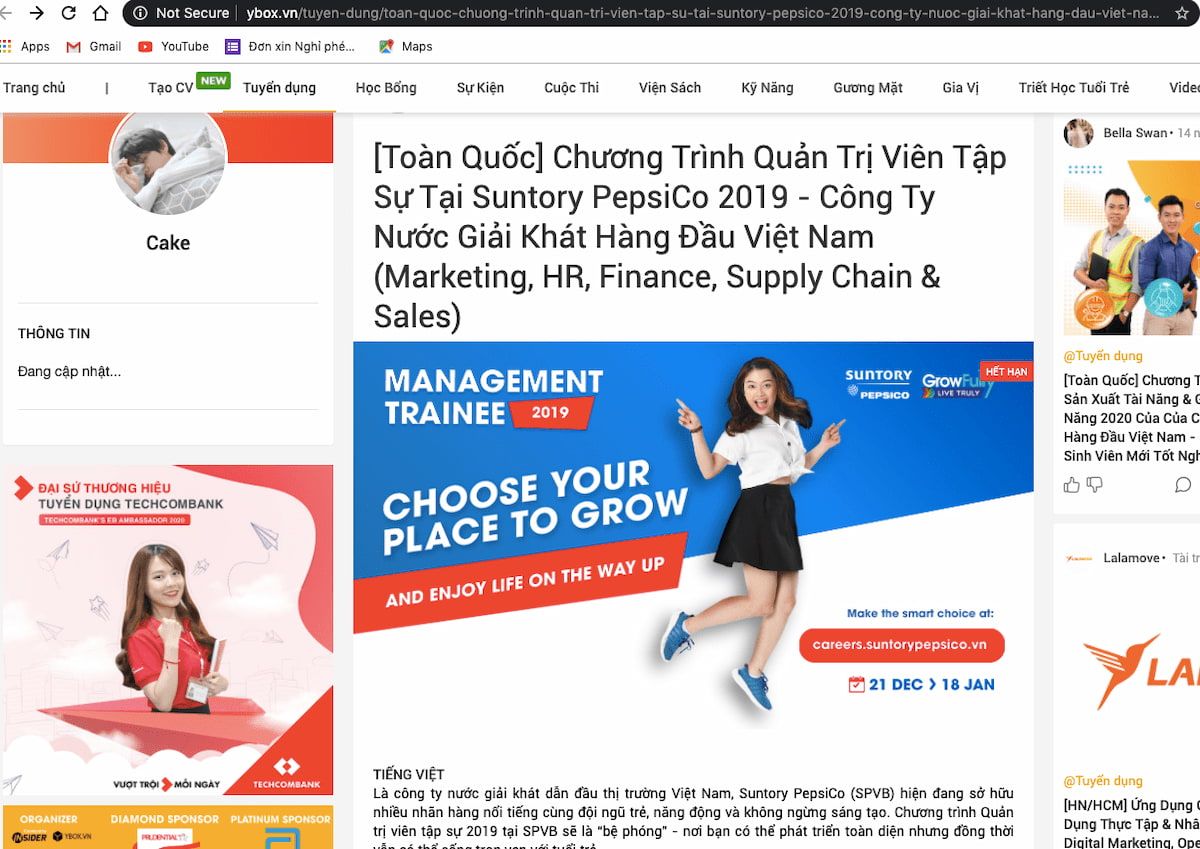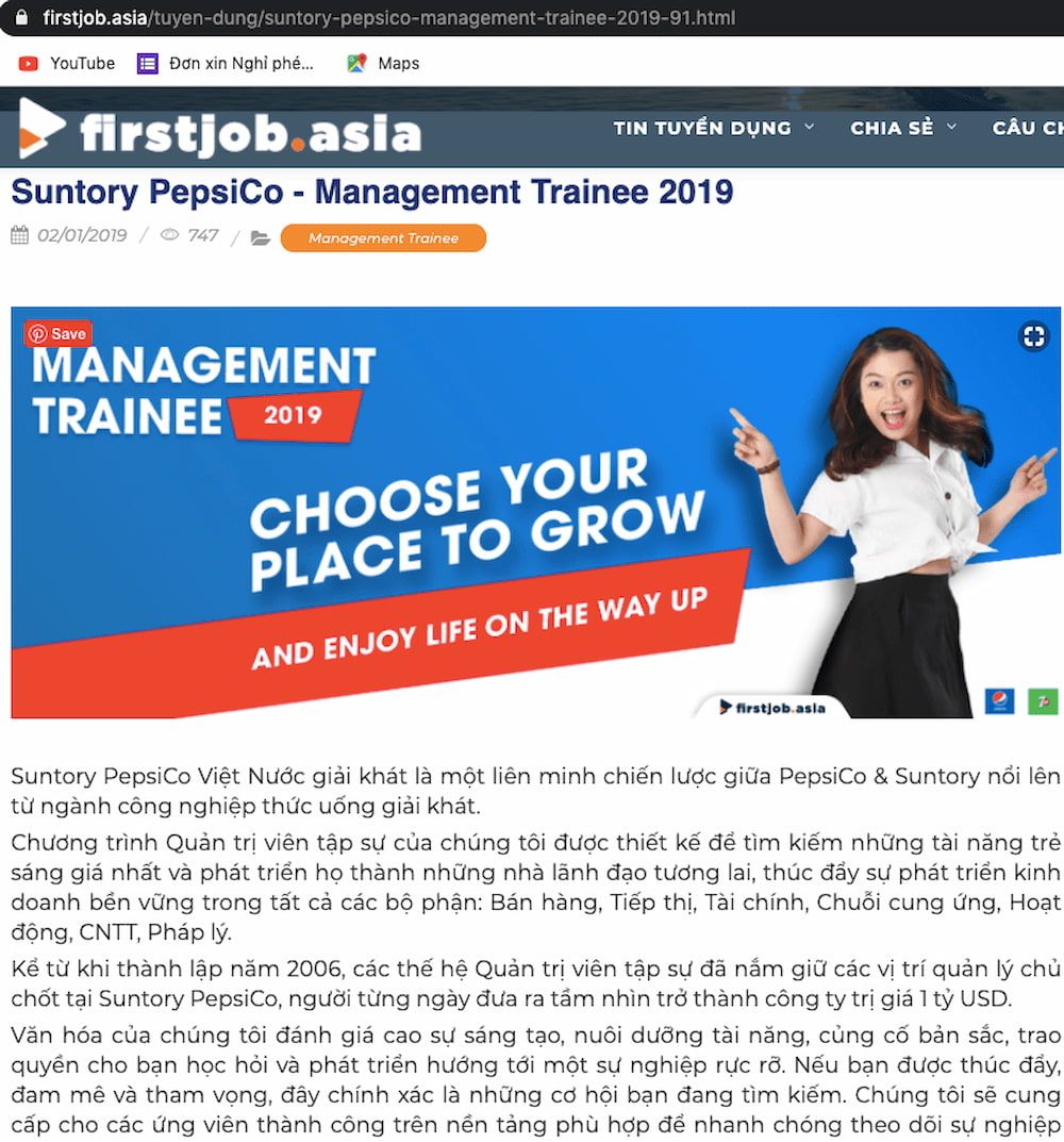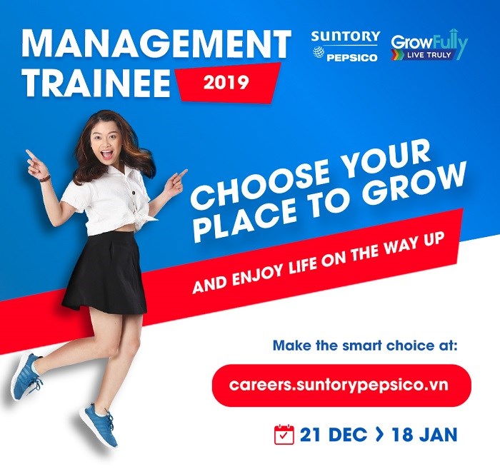 Năm 2019, Suntory PepsiCo Việt Nam đã mở ra nhiều cơ hội nghề nghiệp hấp dẫn cho sinh viên mới tốt nghiệp. Với tầm nhìn là một trong những công ty hàng đầu trong ngành đồ uống tại Việt Nam, chúng tôi cam kết cung cấp môi trường làm việc sáng tạo và năng động. Thông qua việc hợp tác chặt chẽ với các trường đại học, chúng tôi đã tổ chức gần 7.000 cuộc phỏng vấn để tìm kiếm những tài năng trẻ.