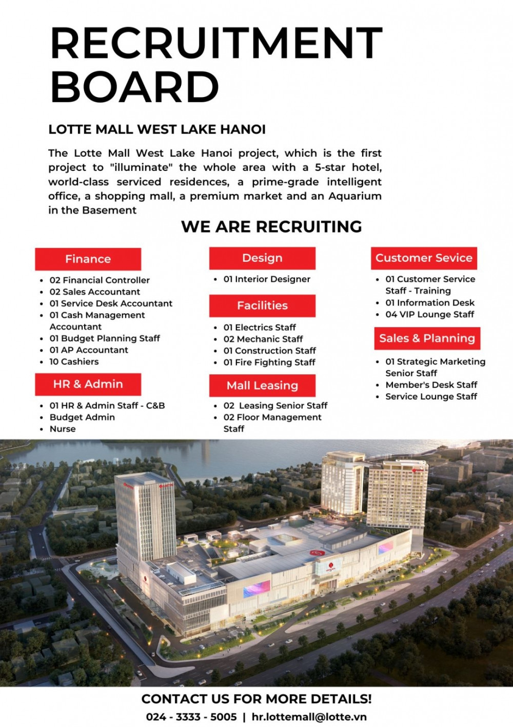 Đừng bỏ lỡ cơ hội này! Hãy ứng tuyển ngay hôm nay để tham gia vào đội ngũ năng động và sáng tạo của Lotte Properties Hà Nội. Nếu bạn đang tìm kiếm một công việc với nhiều cơ hội thăng tiến, đây chính là nơi bạn cần!