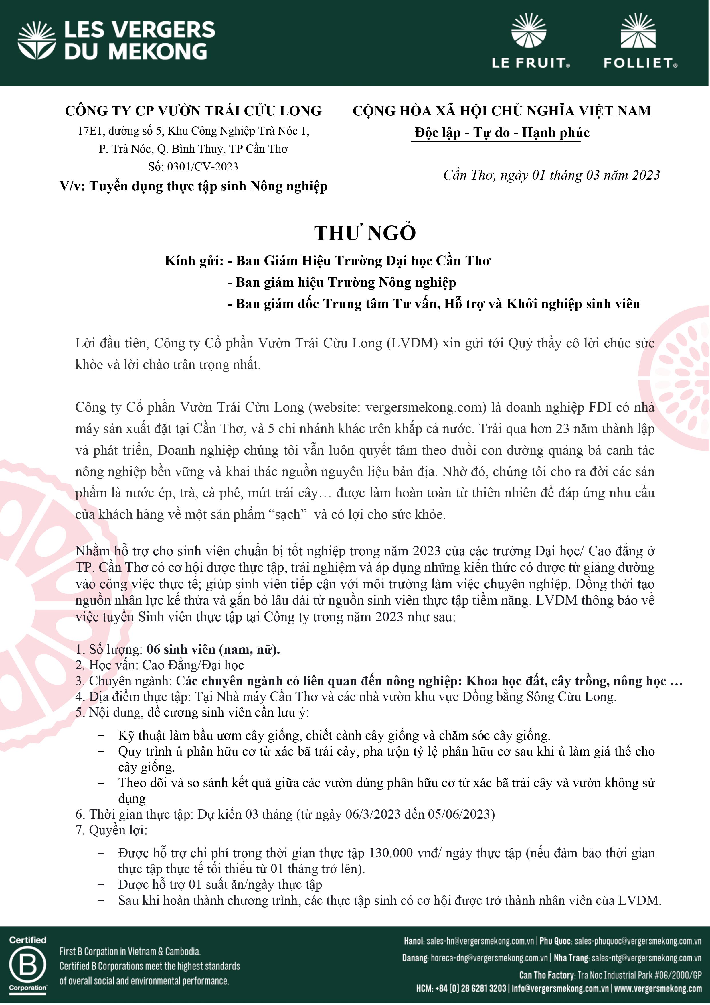 Hiện nay, ngành trái cây đang phát triển mạnh mẽ tại khu vực Đồng bằng sông Cửu Long, đặc biệt là ở thành phố Cần Thơ. Đáp ứng nhu cầu mở rộng sản xuất, nhiều công ty trái cây Cần Thơ tuyển dụng liên tục với đa dạng vị trí hấp dẫn dành cho người lao động. Cơ hội việc làm tại đây vô cùng phong phú, từ nhân viên sản xuất, kỹ thuật, kinh doanh đến các vị trí quản lý. Nếu bạn đang tìm kiếm việc làm ổn định, chế độ đãi ngộ tốt thì đừng bỏ lỡ các tin tuyển dụng công ty trái cây Cần Thơ cập nhật mới nhất sau đây.