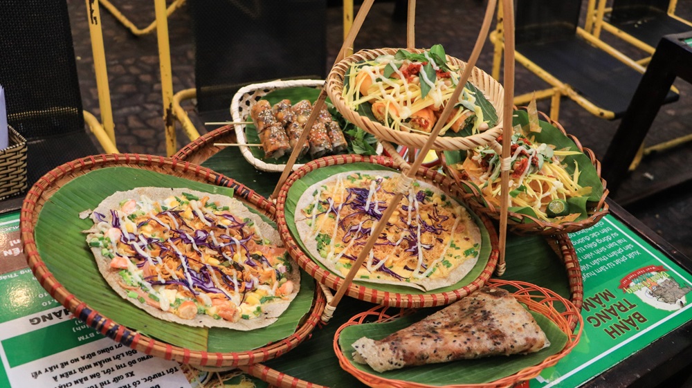 Tại đây, bánh tráng được chế biến từ nguyên liệu tươi ngon, lớp bánh mỏng được nướng trên bếp than hồng, mang đến mùi thơm nức mũi. Đặc biệt, bánh được rắc hành lá xào với ruốc thật đậm đà, kèm theo một quả trứng vịt bùi bùi, tạo nên hương vị đặc trưng khó quên.
