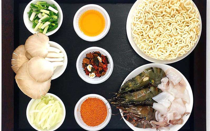 Mì cay hải sản nổi bật với sự kết hợp giữa hương vị đậm đà và độ cay nồng đặc trưng. Để có một tô mì cay hoàn hảo, bạn cần chuẩn bị một số nguyên liệu chính như mì Hàn Quốc, nấm kim châm, bắp cải tím, bông cải xanh, và tất nhiên không thể thiếu hải sản tươi ngon như tôm, mực và thịt bò.