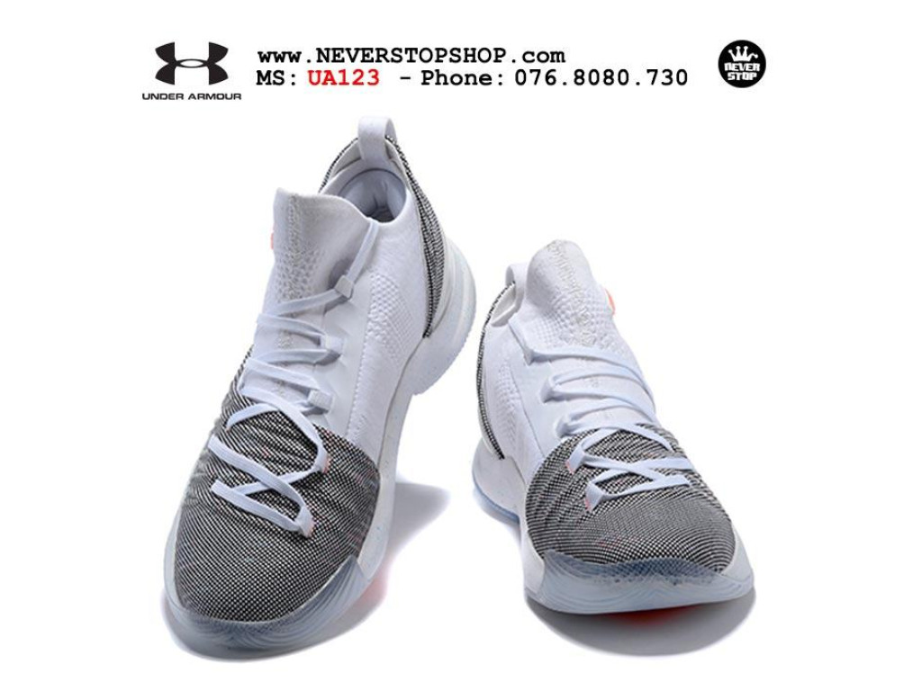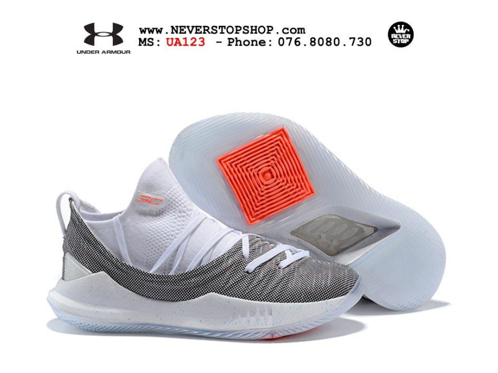 Phiên bản màu của giày Curry 5 rất đa dạng và mỗi phối màu đều mang một câu chuyện riêng, thể hiện cá tính và phong cách của Stephen Curry. Một trong những phiên bản nổi bật là Curry 5 Black/White, với phần upper màu đen kết hợp cùng midsole trắng sáng, tạo nên sự tương phản rõ nét. Thiết kế này tượng trưng cho hai mặt đối lập trong lối chơi của Curry: vừa có thể ném bóng từ xa chính xác, vừa xử lý linh hoạt gần rổ, thể hiện sự đa dạng và khác biệt trong phong cách thi đấu của anh.