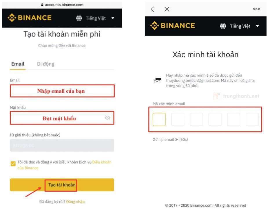 Ngay sau khi nhập thông tin, Binance sẽ gửi một mã xác minh gồm 6 chữ số đến email hoặc điện thoại của bạn. Bạn nhập mã này để xác nhận tài khoản. Tiếp theo, hãy tạo một mật khẩu mạnh, bao gồm chữ hoa, chữ thường, số và ký tự đặc biệt để đảm bảo an toàn cho tài khoản.