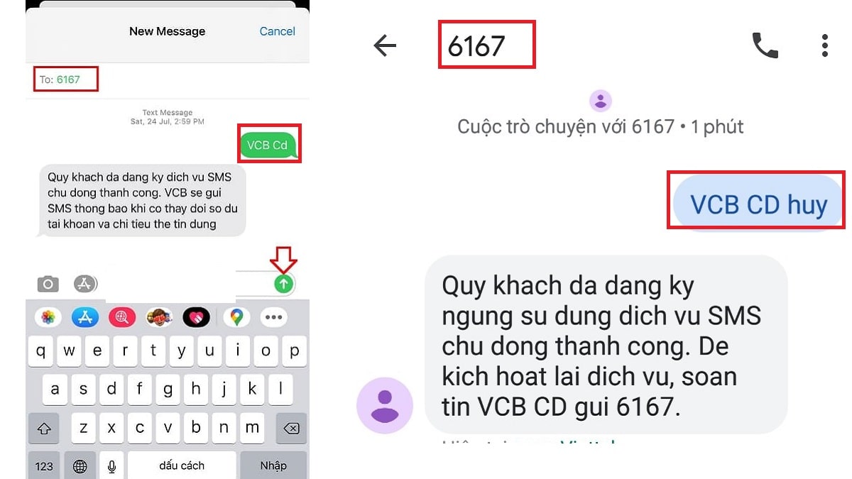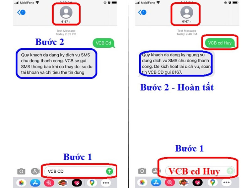 Nếu muốn sử dụng cú pháp tin nhắn, bạn chỉ cần soạn “VCB CD” và gửi đến 6167 để đăng ký. Việc hủy dịch vụ cũng vô cùng đơn giản, chỉ cần soạn “VCB CD HUY” và gửi đến 6167.