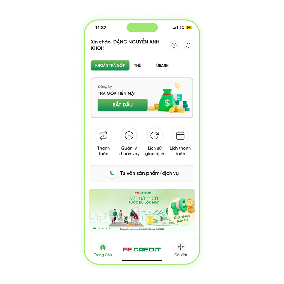 Sau khi đăng nhập thành công, bạn sẽ có thể quản lý các khoản vay của mình, theo dõi lịch thanh toán và thực hiện những giao dịch trực tuyến một cách dễ dàng. Ứng dụng còn mang đến cho bạn các chương trình khuyến mãi hấp dẫn cùng khả năng tích lũy điểm thưởng, giúp bạn tối ưu hóa các dịch vụ mà FE CREDIT cung cấp.