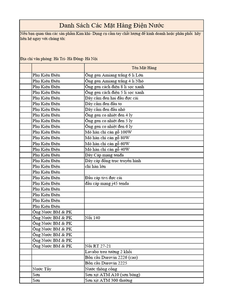 Khi nhắc đến danh mục mặt hàng điện nước, chúng ta không thể không kể đến những sản phẩm thiết yếu phục vụ cho cuộc sống hàng ngày. Trong đó, nhóm thiết bị điện bao gồm công tắc, ổ cắm, bóng đèn LED và dây điện, với mức giá dao động từ 20.000 đến 500.000 VNĐ/chiếc. Những vật tư này giúp đảm bảo an toàn và tiện nghi trong gia đình.