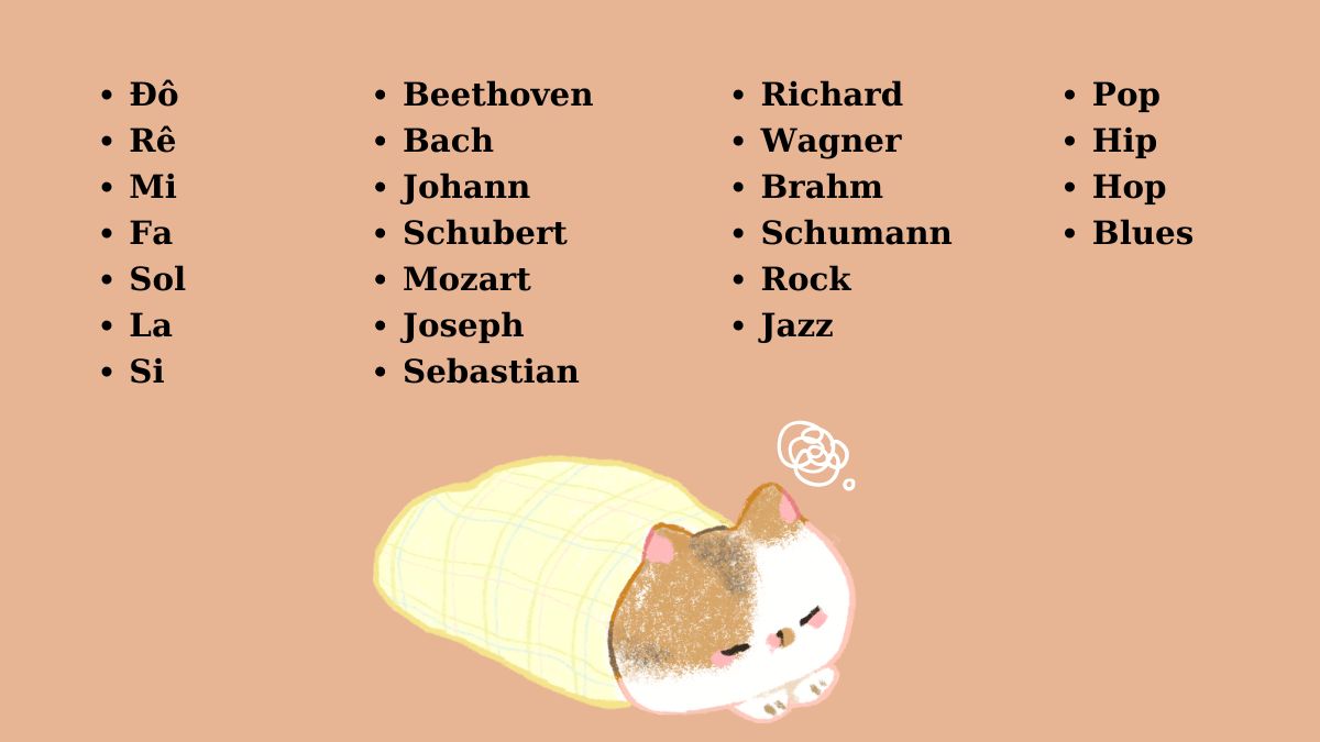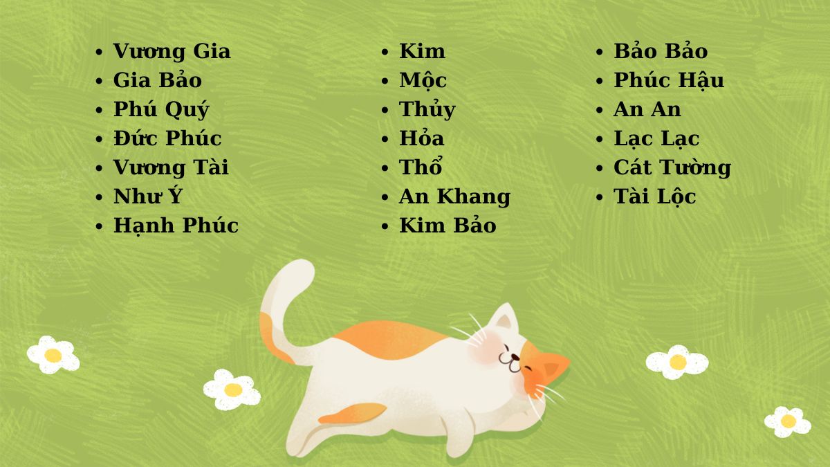 Bạn cũng có thể đặt theo ngoại hình: Vàng cho mèo vàng óng, Đốm cho em có họa tiết dễ thương, hoặc theo phong thủy như Phú Quý, Hạnh Phúc để mang may mắn. Hoặc lấy cảm hứng âm nhạc: Mi, La, Sol – ngắn gọn, vui tai.