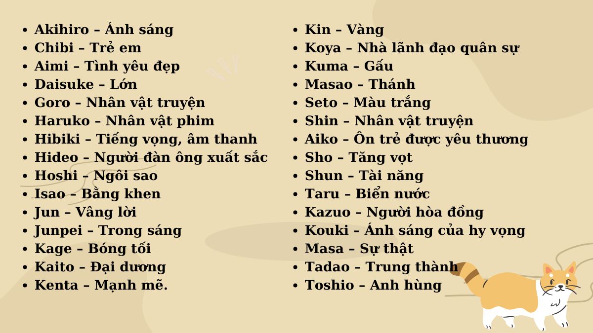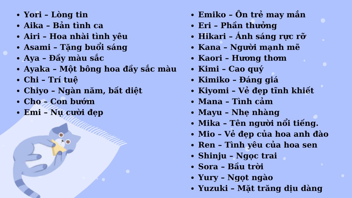 Bạn cũng có thể lấy cảm hứng từ những tên tiếng Nhật đẹp và ý nghĩa. Chẳng hạn, “Hikari” (ánh sáng rực rỡ), “Kaori” (hương thơm), hay “Mio” (vẻ đẹp của hoa anh đào) đều là những lựa chọn tuyệt vời cho mèo cái. Những tên này không chỉ dễ nghe mà còn mang ý nghĩa sâu sắc.