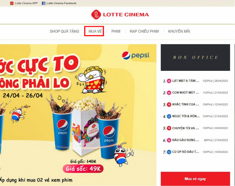 Đặt vé xem phim tại Lotte Cinema thật đơn giản và tiện lợi. Đầu tiên, bạn hãy truy cập vào trang web chính thức của Lotte Cinema, nơi có nhiều thông tin và lựa chọn cho bạn. Tại giao diện chính, bạn sẽ tìm thấy nút “Mua vé ngay” nằm ở góc dưới bên phải, hãy nhấn vào đó để bắt đầu quá trình đặt vé.