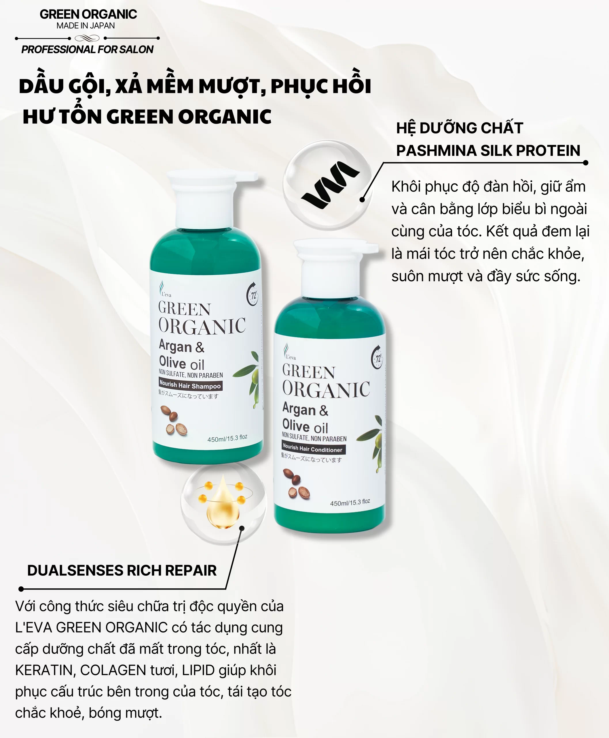 Dầu Argan nổi tiếng với khả năng cấp ẩm và làm mềm tóc hiệu quả, giúp phục hồi tóc khô xơ và chẻ ngọn. Trong khi đó, dầu Olive không chỉ nuôi dưỡng da đầu mà còn kích thích sự mọc tóc, giảm thiểu tình trạng gãy rụng. Green Organic hoàn toàn không chứa paraben hay sulfates, nên rất an toàn cho mẹ bầu, mẹ sau sinh và trẻ em từ 6 tuổi.