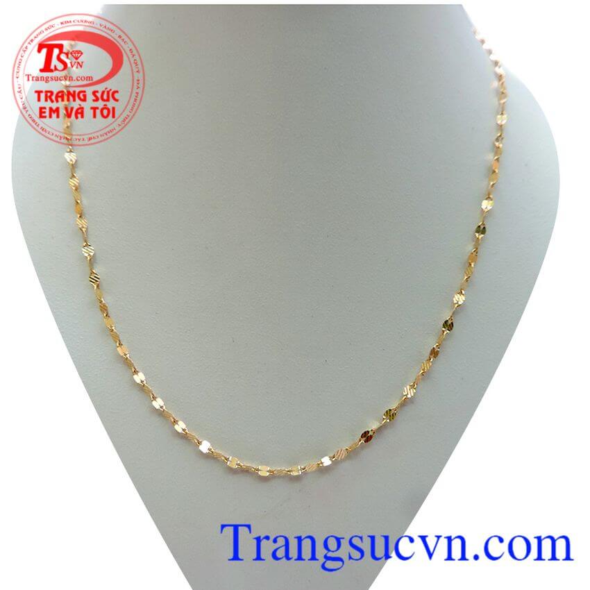 Chất liệu vàng 18K không chỉ đảm bảo độ bền mà còn mang đến vẻ sáng bóng, sang trọng, phù hợp với nhiều phong cách từ đơn giản đến cầu kỳ. Thiết kế của dây chuyền thường nhỏ gọn, thanh lịch, tạo điểm nhấn tinh tế cho người đeo, giúp bạn thêm phần nữ tính và duyên dáng.