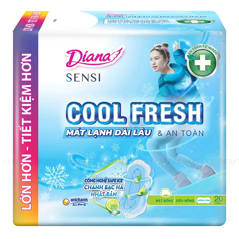 Giá cả này có thể thay đổi tùy theo khu vực, cửa hàng và các chương trình khuyến mãi, nên bạn nên tham khảo kỹ tại các điểm bán chính thức để có mức giá chính xác nhất. Diana Cool Fresh nổi bật với thiết kế siêu mỏng, khả năng thấm hút tốt và cảm giác mát lạnh, rất phù hợp cho những ai muốn sự thoải mái và an toàn trong ngày “đèn đỏ”.
