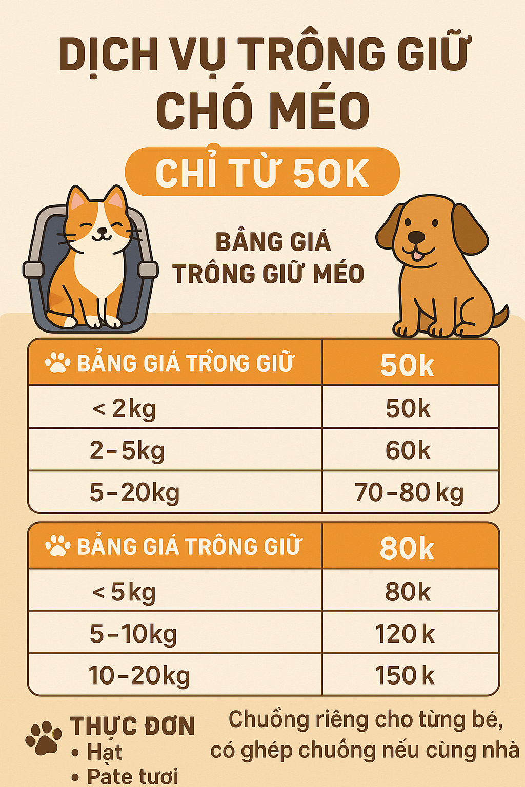 Điều hay nhất là các chỗ uy tín luôn đảm bảo chuồng trại sạch sẽ, thoáng mát, nhân viên tận tình như chăm con mình vậy. Giá phải chăng dựa trên chế độ ăn và dịch vụ kèm, giúp bạn tiết kiệm mà vẫn chất lượng. Nếu cần gửi lâu dài, cứ gọi hotline tư vấn miễn phí để chọn gói phù hợp nhé!