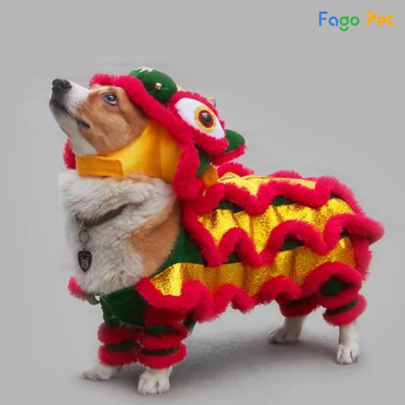 Những bộ đồ này thường được may hình lân rồng đỏ rực, với hai chân trước khoác áo lân ngộ nghĩnh, phù hợp cho chó nhỏ như Pug, Bull hay Corgi. Chất liệu mềm mại, thoáng khí, không làm bé khó chịu khi “diễn” múa lân cùng chủ.