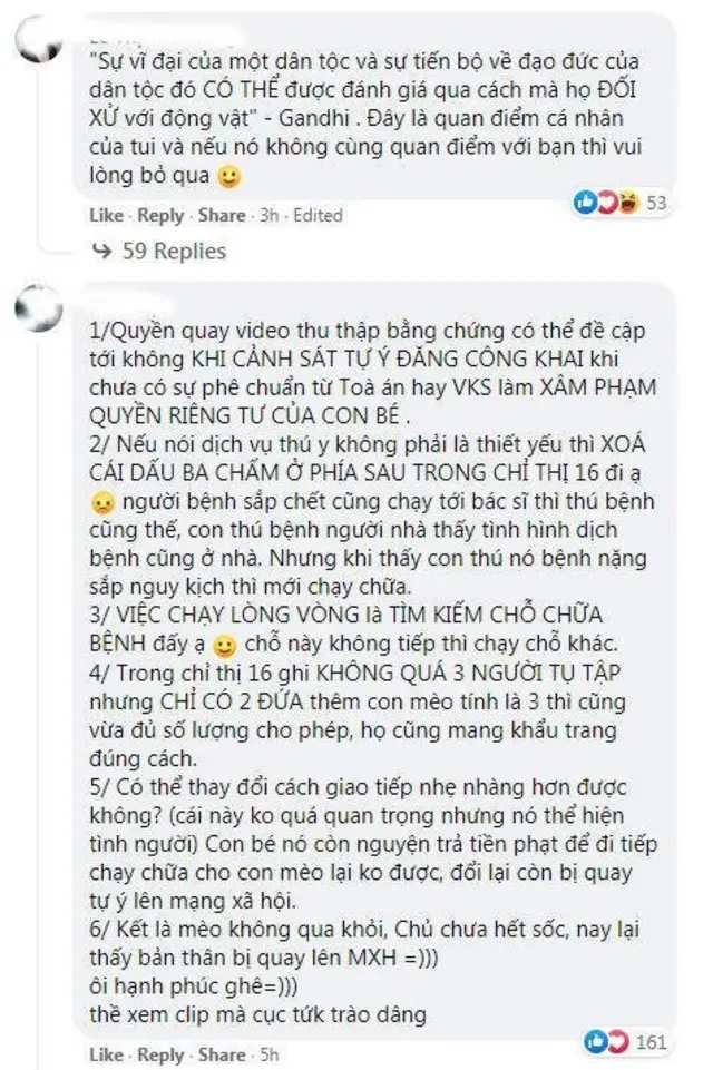 Mọi người tranh cãi dữ dội trên mạng. Một bên thương con mèo và hai bạn trẻ, bên kia bảo tính mạng con người quan trọng hơn, tránh lây lan dịch. Cuối cùng, lực lượng chức năng làm đúng quy định để bảo vệ cộng đồng.