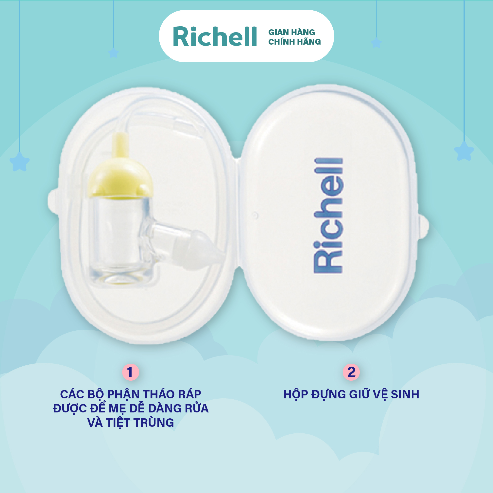 Vệ sinh dụng cụ hút mũi Richell là một phần quan trọng trong việc chăm sóc sức khỏe cho bé yêu của bạn. Sau khi sử dụng, mẹ hãy rửa sạch máy hút mũi bằng nước ấm cùng với xà phòng hoặc dung dịch tẩy rửa chuyên dụng cho trẻ nhỏ như nước rửa bình sữa. Việc này giúp bảo đảm rằng dụng cụ luôn sạch sẽ, an toàn cho bé mỗi lần sử dụng.