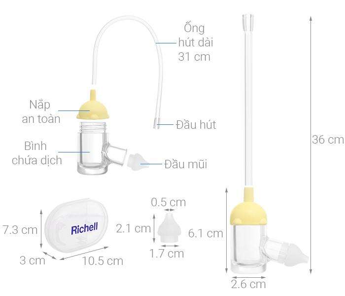 Trong hành trình nuôi dưỡng bé yêu, không thể không nhắc đến dụng cụ hút mũi Richell. Sản phẩm này được làm từ nhựa PP cao cấp và silicone mềm mại, hoàn toàn an toàn cho mũi nhậy cảm của trẻ. Thiết kế thông minh với đầu hút silicon ôm khít giúp hút sạch dịch nhầy mà không gây khó chịu cho bé.