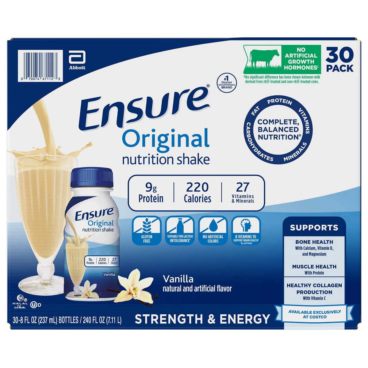Ensure® Original Vanilla Nutrition Drink là lựa chọn tuyệt vời cho những ai muốn bổ sung dinh dưỡng đầy đủ và cân bằng cho sức khỏe hàng ngày. Mỗi chai 237ml chỉ chứa 220 calo và 9g protein, cung cấp cho bạn năng lượng cần thiết. Ngoài ra, sản phẩm còn trang bị đến 27 vitamin và khoáng chất thiết yếu để hỗ trợ cơ thể.