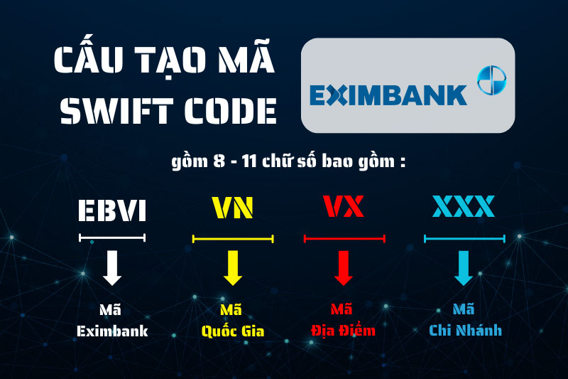 Mã Swift Code của Eximbank là EBVIVNVX, một mã định danh quốc tế quan trọng giúp xác định ngân hàng này trên toàn cầu. Mỗi mã SWIFT/BIC bao gồm từ 8 đến 11 ký tự. Trong đó, bốn ký tự đầu tiên (EBVI) là mã ngân hàng, tiếp theo là mã quốc gia (VN) và mã thành phố (VX), phản ánh chính xác vị trí của Eximbank.
