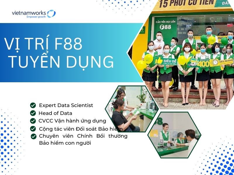 Ngoài ra, F88 cũng rất chú trọng đến việc phát triển nghề nghiệp. Ứng viên có thể nhanh chóng thăng tiến lên vị trí trưởng phòng giao dịch chỉ sau 6 tháng đến 1 năm, nhờ vào các khóa đào tạo bài bản. Để ứng tuyển, ứng viên cần có độ tuổi từ 18 đến 35, ngoại hình ưa nhìn và tinh thần trách nhiệm cao.