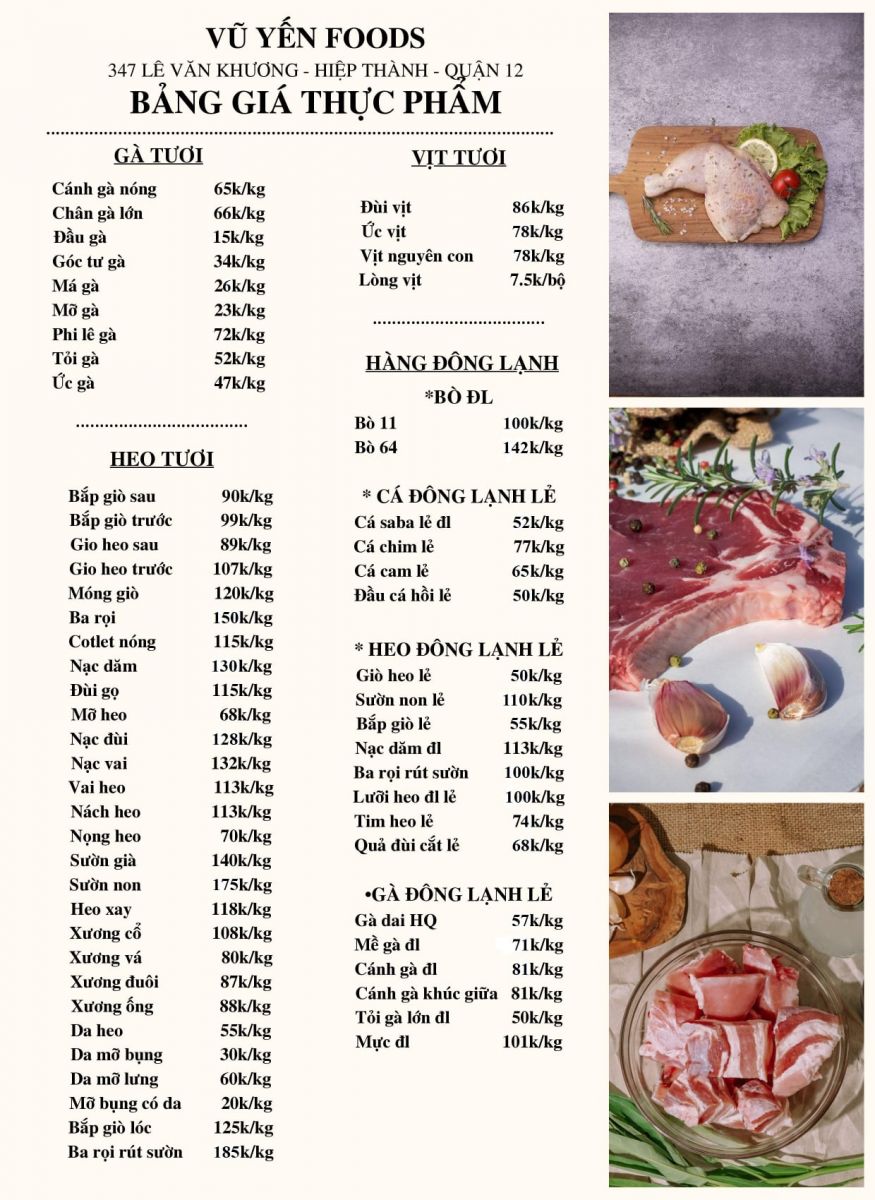 Công ty Vũ Yến tự hào là một trong những nhà cung cấp thực phẩm đông lạnh chất lượng cao nhất tại Bình Dương. Chúng tôi chuyên cung cấp đa dạng sản phẩm từ thịt heo, bò đến gà, đáp ứng mọi nhu cầu của khách hàng. Đặc biệt, thịt gà đông lạnh của chúng tôi rất được ưa chuộng, bao gồm đùi gà, cánh gà, chân gà và nhiều loại khác.