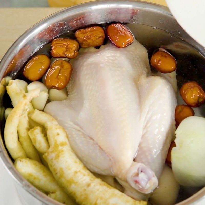 Đừng quên các nguyên liệu bổ trợ như táo tàu và hạt sen, giúp tăng cường giá trị dinh dưỡng cho món ăn. Gạo nếp sau khi ngâm khoảng một tiếng sẽ trở nên mềm hơn, giúp làm dày nước dùng. Khi tất cả nguyên liệu đã sẵn sàng, bạn chỉ cần cho vào nồi cùng với nước và gia vị như muối, đun nhỏ lửa cho đến khi thịt gà chín mềm.