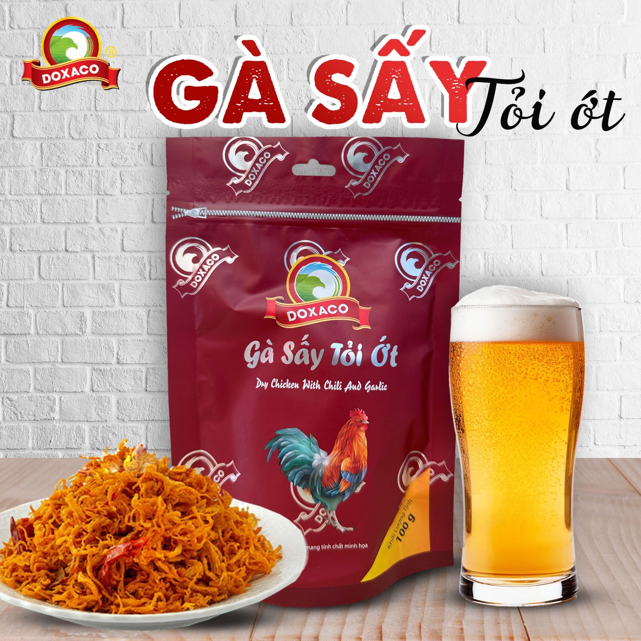 Gà Sấy Tỏi Ớt Doxaco là một món ăn vặt độc đáo mang đậm hương vị Việt Nam. Với 90% là thịt gà tươi, món ăn này không chỉ ngon miệng mà còn rất giàu giá trị dinh dưỡng. Thịt gà sau khi nướng đến độ giòn rụm sẽ được ướp cùng tỏi tươi, mang lại hương thơm hấp dẫn, kết hợp với ớt hiểm cay nồng tạo nên một vị chua cay đặc trưng.