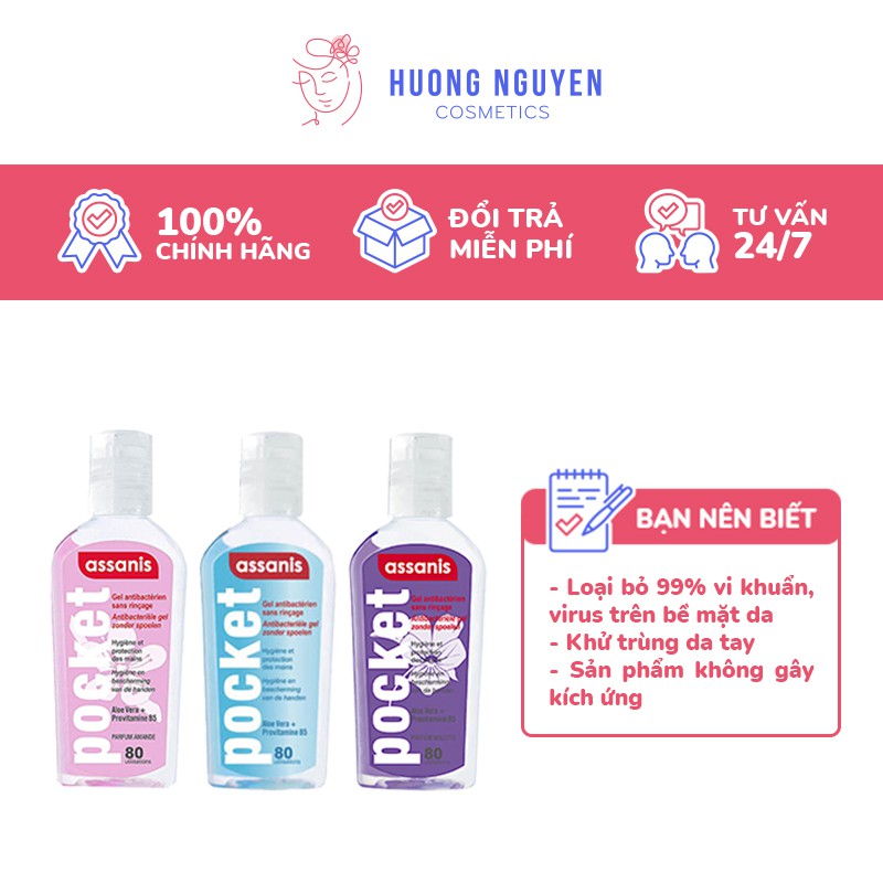 Bên cạnh đó, nếu bạn tìm sản phẩm tiện dụng để mang theo bên mình, gel rửa tay khô Assanis Pocket có dung tích 80ml là lựa chọn lý tưởng. Bạn nên lưu ý đến bao bì, nhãn mác và nguồn gốc xuất xứ để tránh mua phải hàng giả, hàng nhái không rõ nguồn gốc.