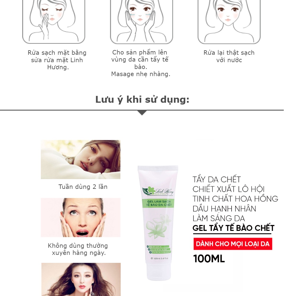 Sử dụng gel tẩy tế bào chết Linh Hương là một cách tuyệt vời để giúp làn da của bạn luôn sáng mịn và sạch sẽ. Trước tiên, sau khi rửa mặt bằng sữa rửa mặt, bạn hãy lấy một lượng gel vừa đủ ra tay. Thoa đều gel lên mặt, đảm bảo lớp gel phủ đều lên toàn bộ khuôn mặt.
