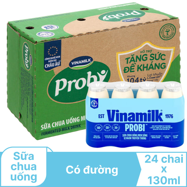 Sữa chua Probi được sản xuất bởi Vinamilk, hợp tác với công ty men sống hàng đầu châu Âu, mang đến sản phẩm chứa 13 tỷ lợi khuẩn L. Casei 431® trong mỗi chai 130ml. Sản phẩm này không chỉ giúp hỗ trợ tiêu hóa mà còn tăng cường đề kháng, được Tổng Hội Y học Việt Nam khuyên dùng. Sữa chua Probi có nhiều hương vị đa dạng như có đường, ít đường, việt quất, mật ong nghệ, lựu hay hương đào, phù hợp cho cả gia đình sử dụng (trừ trẻ dưới 1 tuổi).