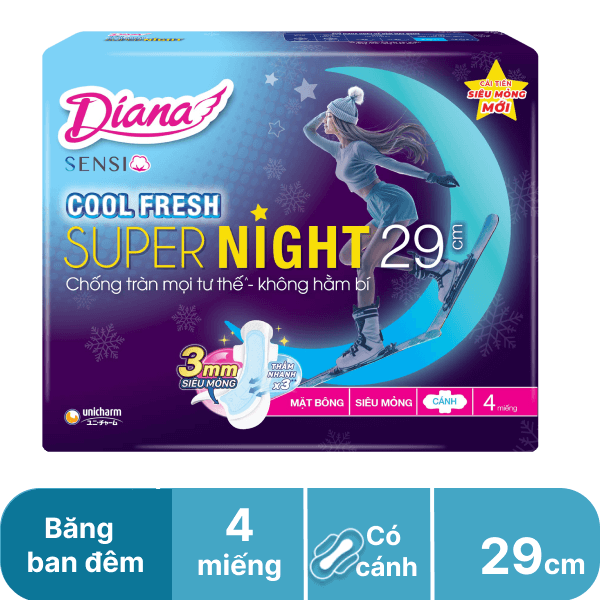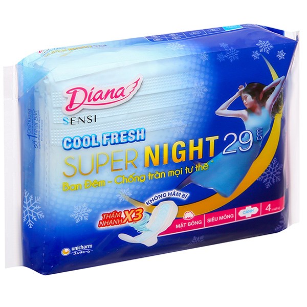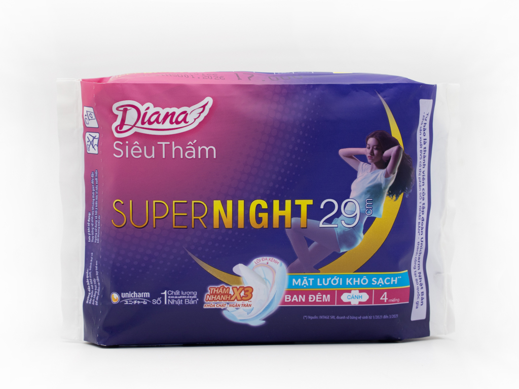 Ngoài ra, dòng Diana Super Night ban đêm với chiều dài 29cm, thiết kế siêu thấm và chống tràn cũng rất được ưa chuộng. Giá của sản phẩm này thường vào khoảng 17.000 đồng cho gói 4 miếng, mang lại sự an tâm cho các bạn nữ trong những ngày kinh nguyệt nhiều, đặc biệt là ban đêm.