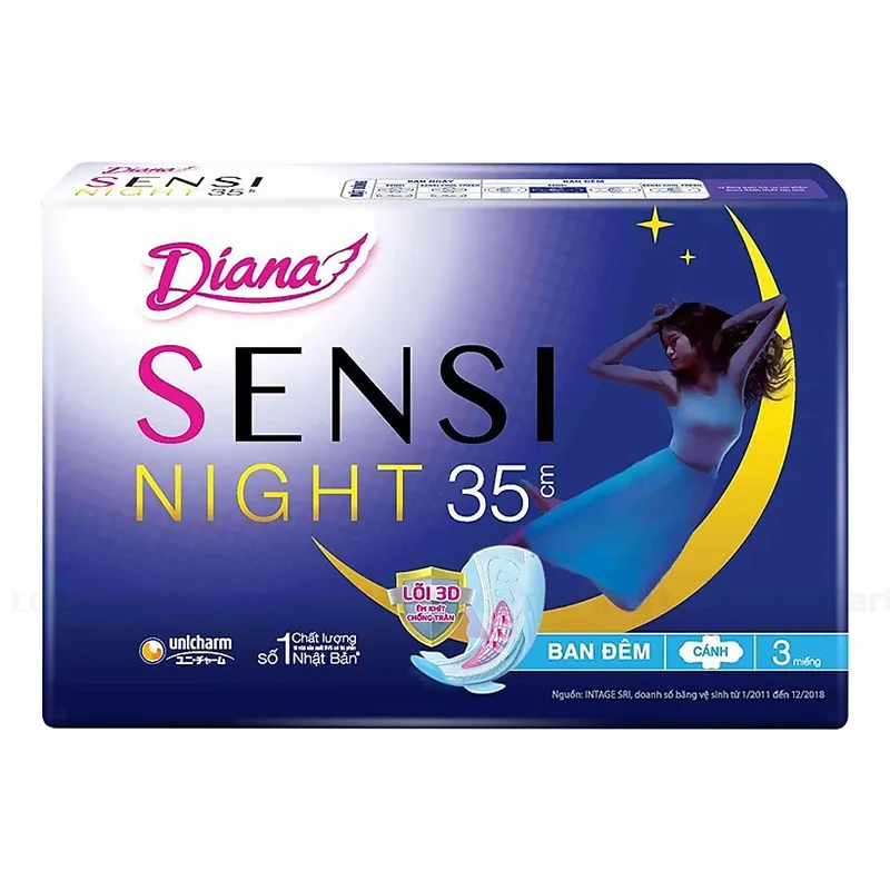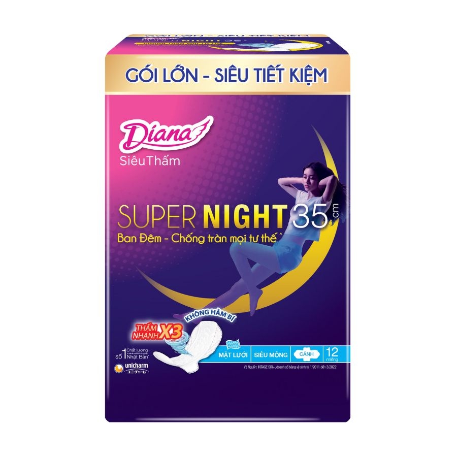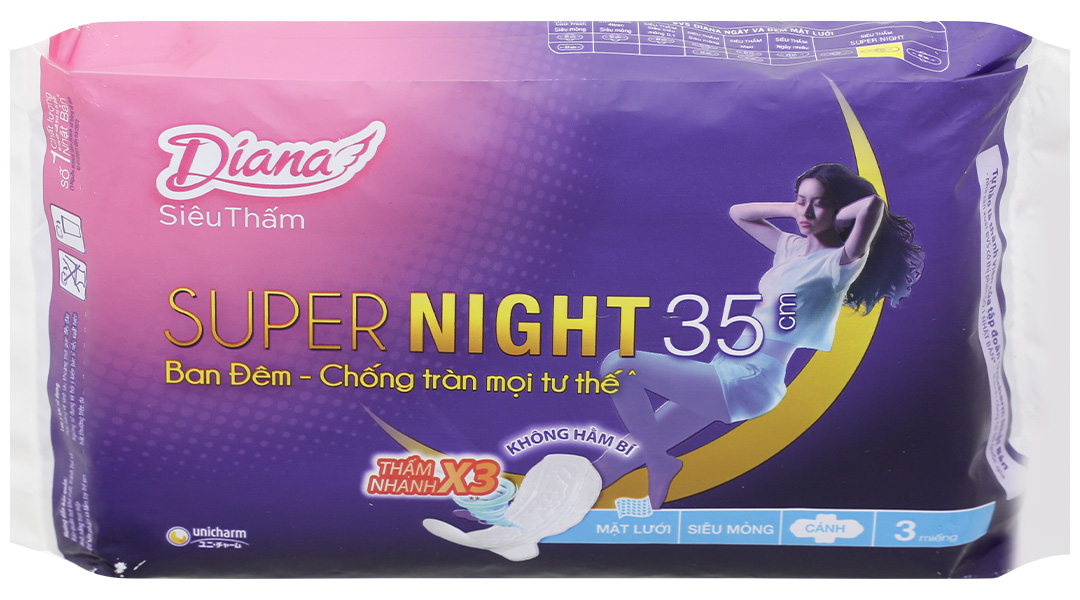 Sản phẩm băng vệ sinh Diana ban đêm được đánh giá cao về khả năng thấm hút nhanh, chống tràn hiệu quả nhờ thiết kế thông minh với phần cánh rộng và hệ thống rãnh cố định miếng băng. Bề mặt băng mềm mại, nhẹ nhàng với da nhạy cảm, giúp giữ khô thoáng suốt đêm, rất phù hợp để yên tâm ngủ ngon. Diana là thương hiệu thuộc tập đoàn Unicharm Nhật Bản, nổi tiếng với công nghệ tiên tiến và chất lượng ổn định, nên sản phẩm được nhiều người tin dùng.