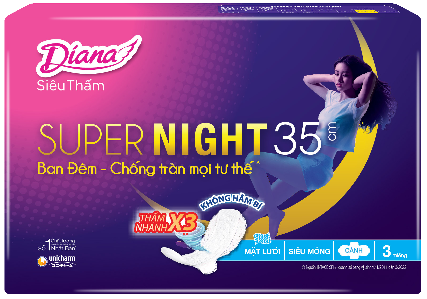 Điểm nổi bật của băng vệ sinh Diana ban đêm là thiết kế thông minh với công nghệ lõi đa kênh giúp thấm hút nhanh, chống tràn hiệu quả, đồng thời bề mặt mềm mại, không gây kích ứng da. Sản phẩm còn có phần cánh mở rộng, ôm sát cơ thể, giúp bạn thoải mái vận động và ngủ ngon suốt đêm mà không lo bị tràn hay khó chịu.