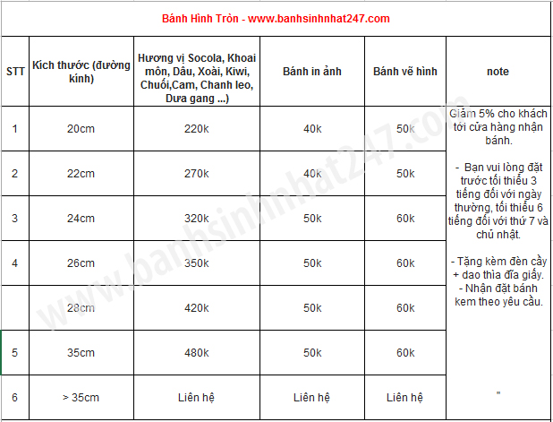 Khi tìm kiếm bánh kem sinh nhật cho bữa tiệc của bạn, bảng giá dưới đây sẽ giúp bạn dễ dàng hơn trong việc lựa chọn. Chúng tôi cung cấp nhiều mẫu mã và hương vị khác nhau, từ bánh kem vị phô mai thơm ngon đến bánh kem vị cà phê đậm đà và bánh kem caramel ngọt ngào.