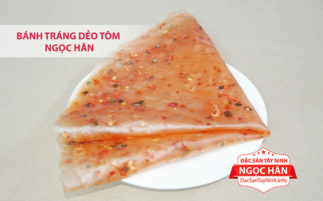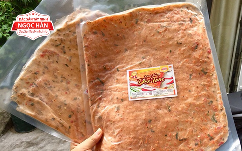 Bánh tráng dẻo tôm là một trong những món đặc sản nổi tiếng của Tây Ninh, được nhiều du khách và người dân yêu thích. Được đóng gói tiện lợi trong từng bịch 500 gram, bánh có đường kính từ 30 đến 35 cm, mang màu sắc hấp dẫn với lớp màu đỏ nhạt từ ớt. Bánh có vị ngon đặc trưng nhờ vào tôm khô, hành phi và muối tôm, tạo nên hương vị mặn ngọt hài hòa, cùng chút cay cay, khiến người ăn không thể quên.