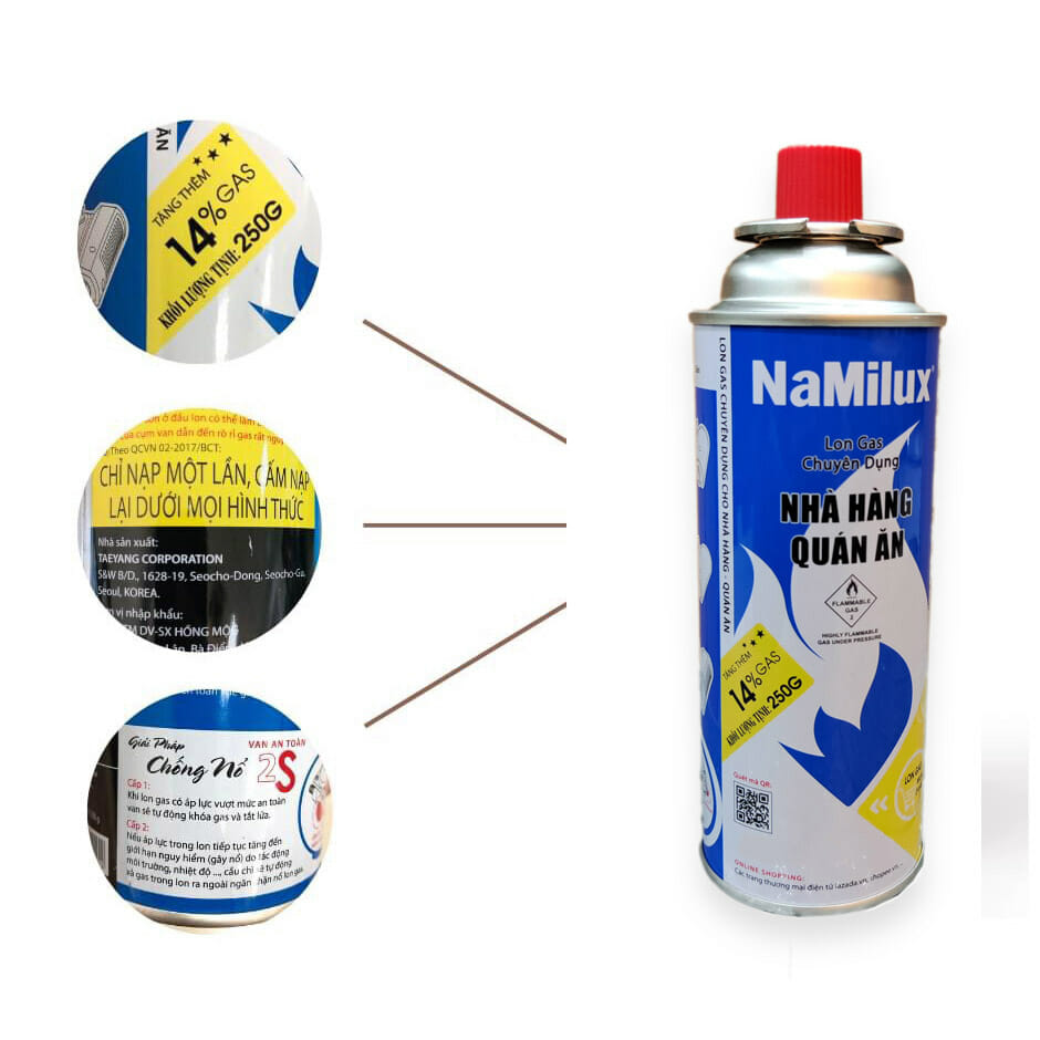 Sản phẩm Namilux có thiết kế nhỏ gọn, dễ dàng mang theo, thích hợp cho các bếp gas du lịch hoặc các loại đèn khò. Với việc nhập khẩu từ Hàn Quốc, bình gas mini Namilux được đảm bảo an toàn chống cháy nổ, mang lại sự yên tâm cho người sử dụng. Mỗi lon gas mini có khối lượng khoảng 250g, hoàn toàn đủ để phục vụ cho nhu cầu nấu ăn hàng ngày.