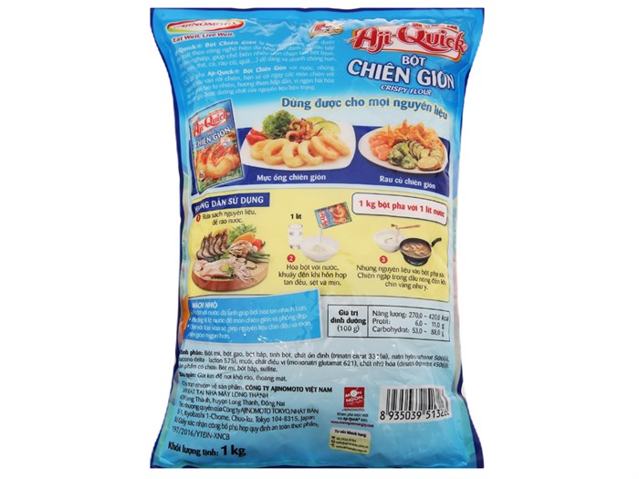 Thành phần của bột gồm bột mì, bột ngô, muối và các gia vị đặc trưng, đảm bảo an toàn và không chứa chất bảo quản gây hại. Bột chiên giòn Aji Quick không chỉ dùng để chiên gà mà còn rất đa năng, có thể áp dụng cho cá, tôm, rau củ, giúp bữa ăn gia đình thêm phong phú và hấp dẫn hơn. Lớp vỏ chiên vàng đẹp mắt, giòn tan, tạo cảm giác ngon miệng, đặc biệt phù hợp với trẻ nhỏ vốn khó ăn rau và cá.
