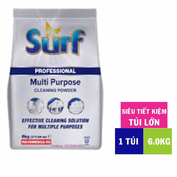 Bột giặt Surf nổi tiếng với khả năng làm sạch hiệu quả, hương thơm dễ chịu và giá cả hợp lý, rất phù hợp cho các gia đình đông người hoặc những ai muốn tiết kiệm chi phí giặt giũ. Phiên bản 6kg thường được đóng gói dạng bịch lớn, giúp bạn dùng lâu dài mà không phải mua nhiều lần.