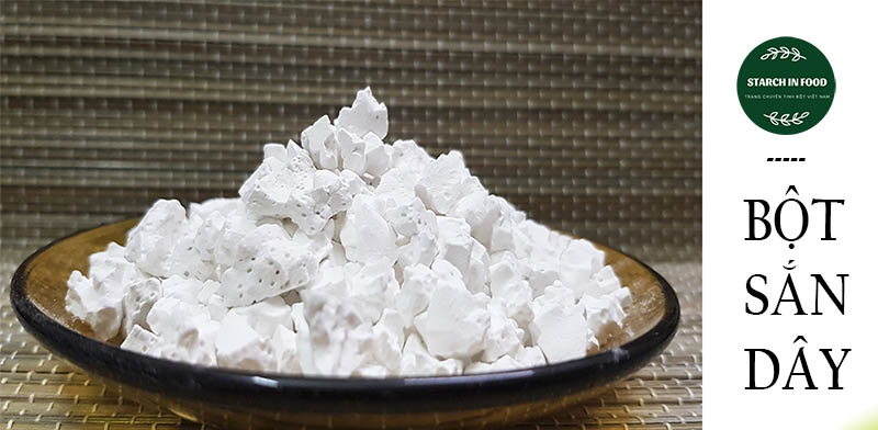 Bột sắn dây được làm từ củ sắn dây tươi, sau khi thu hoạch sẽ được rửa sạch, xay lấy nước, lọc và sấy khô thành bột. Ở các vùng như Đông Triều, Quảng Ninh, bột sắn dây nổi tiếng với độ mịn, trắng và thơm tự nhiên nhờ đất phù sa màu mỡ và nguồn nước sạch. Bột sắn dây không chỉ là nguyên liệu nấu ăn mà còn được dùng làm thức uống giải nhiệt, có giá trị dinh dưỡng và tác dụng tốt cho sức khỏe.