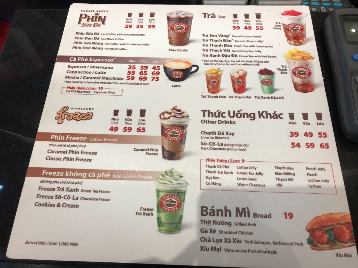Highlands Coffee có mức giá khá hợp lý, phù hợp với nhiều đối tượng khách hàng, đặc biệt là nhân viên văn phòng và các bạn trẻ. Giá các loại cà phê phin truyền thống như phin sữa đá, bạc xỉu đá thường dao động từ khoảng 29.000 đến 39.000 đồng mỗi ly. Các loại cà phê espresso như cappuccino, mocha hay americano có giá cao hơn, từ 35.000 đến 75.000 đồng tùy loại. Ngoài ra, Highlands còn có các thức uống freeze như trà xanh, socola với giá từ 49.000 đến 65.000 đồng, cùng các loại trà sen vàng, thạch đào, thạch vải nằm trong khoảng 39.000 đến 55.000 đồng mỗi ly.