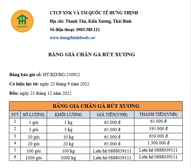 Chân gà rút xương là sản phẩm được nhiều người tiêu dùng ưu tiên lựa chọn nhờ sự tiện lợi và những món ăn hấp dẫn có thể chế biến. Tuy nhiên, giá chân gà rút xương trên thị trường hiện nay luôn thay đổi tùy theo nguồn cung, chất lượng và thời điểm. Năm 2024, nhu cầu mua chân gà rút xương tăng cao đã kéo theo sự biến động về giá cả. Bài viết dưới đây sẽ cập nhật chi tiết bảng giá chân gà rút xương hôm nay, giá sỉ, giá lẻ, cũng như các yếu tố ảnh hưởng cùng kinh nghiệm lựa chọn sản phẩm giá tốt.