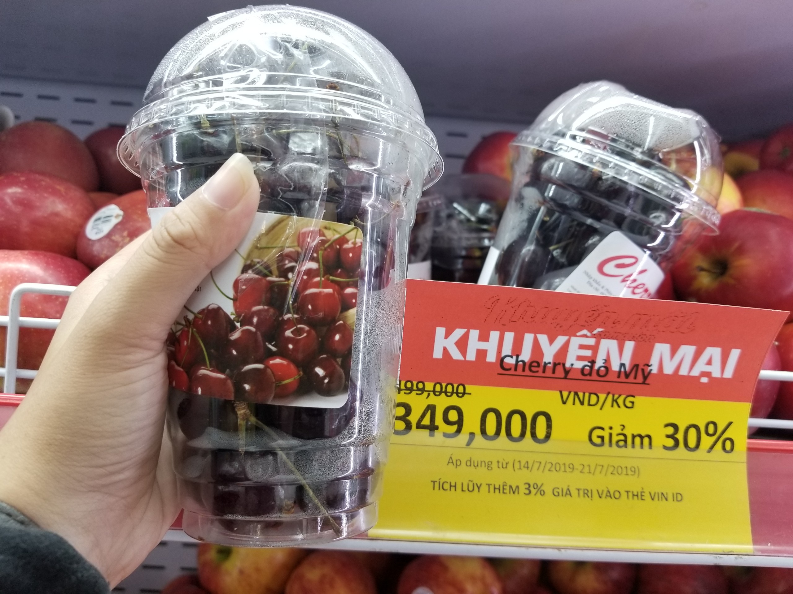 Ngoài ra, cherry nhập khẩu từ Mỹ cũng được bán tại Vinmart với giá khá cạnh tranh. Ví dụ, cherry Mỹ size 9,5 có thể giảm giá xuống còn khoảng 329.000 đồng/kg, thậm chí size 10 có giá thấp nhất khoảng 299.000 đồng/kg trong các đợt khuyến mãi. Đây là mức giá rẻ hơn nhiều so với trước đây do sản lượng cherry Mỹ tăng cao và các chương trình giảm giá tại siêu thị.