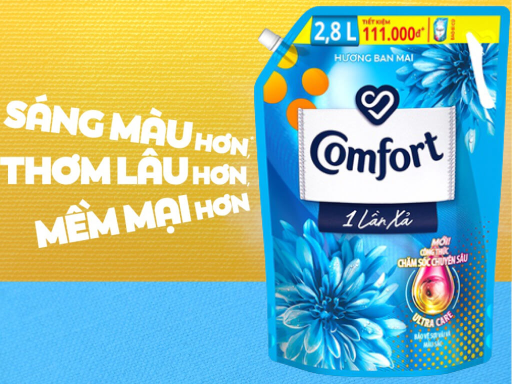 Comfort 1 lần xả có nhiều mùi hương tinh tế, đa dạng như hương ban mai, hương gió xuân hay hương nước hoa thiên nhiên, giúp bạn dễ dàng chọn lựa theo sở thích. Ngoài ra, sản phẩm còn an toàn cho làn da nhạy cảm, phù hợp với cả gia đình có trẻ nhỏ. Giá nước xả Comfort dao động tùy theo dung tích và hương thơm, ví dụ như túi 1,8 lít có giá khoảng 142.000 đồng, còn các loại lớn hơn có giá từ 200.000 đến 270.000 đồng tùy loại.