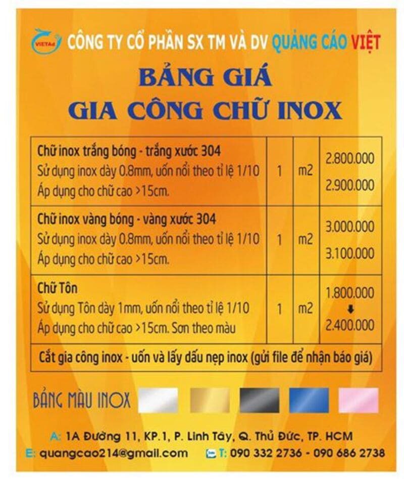 Về bảng giá gia công, chữ inox sáng mặt có giá từ 200.000 đến 350.000 VNĐ, trong khi chữ inox mạ vàng dao động từ 400.000 đến 600.000 VNĐ. Chúng tôi cũng cung cấp chữ inox trắng và xước với mức giá từ 2.700.000 VNĐ/m² đến 3.200.000 VNĐ/m². Tất cả đều được minh bạch và cạnh tranh, phù hợp với nhu cầu của khách hàng.
