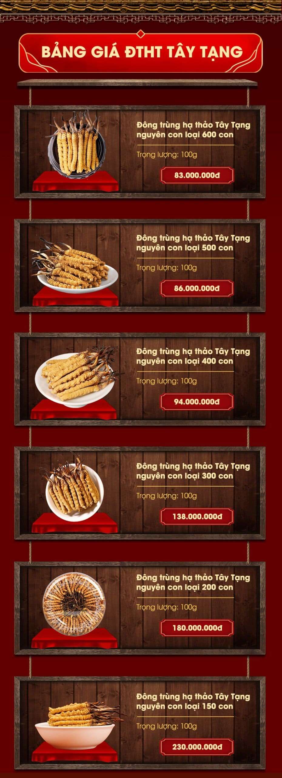 Ngoài ra, đông trùng hạ thảo Tây Tạng còn được phân loại theo dạng nguyên con, dạng nấm, dạng viên hay dạng nước, mỗi loại có mức giá khác nhau. Ví dụ, dạng viên có giá từ vài trăm nghìn đến hơn 1 triệu đồng cho hộp 30 viên, còn dạng nước từ 900 nghìn đến 1,5 triệu đồng cho hộp 30 gói.