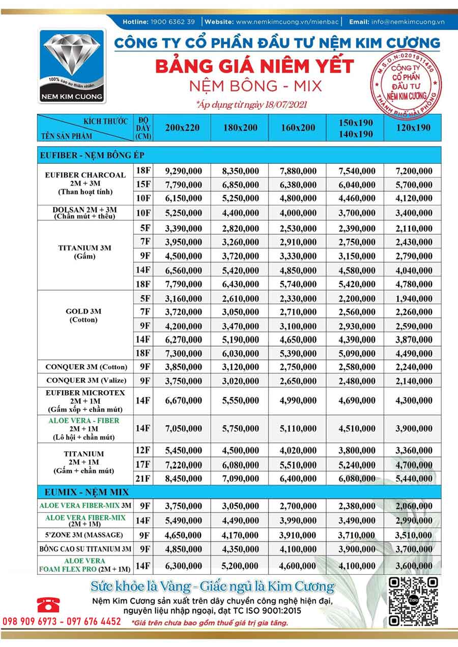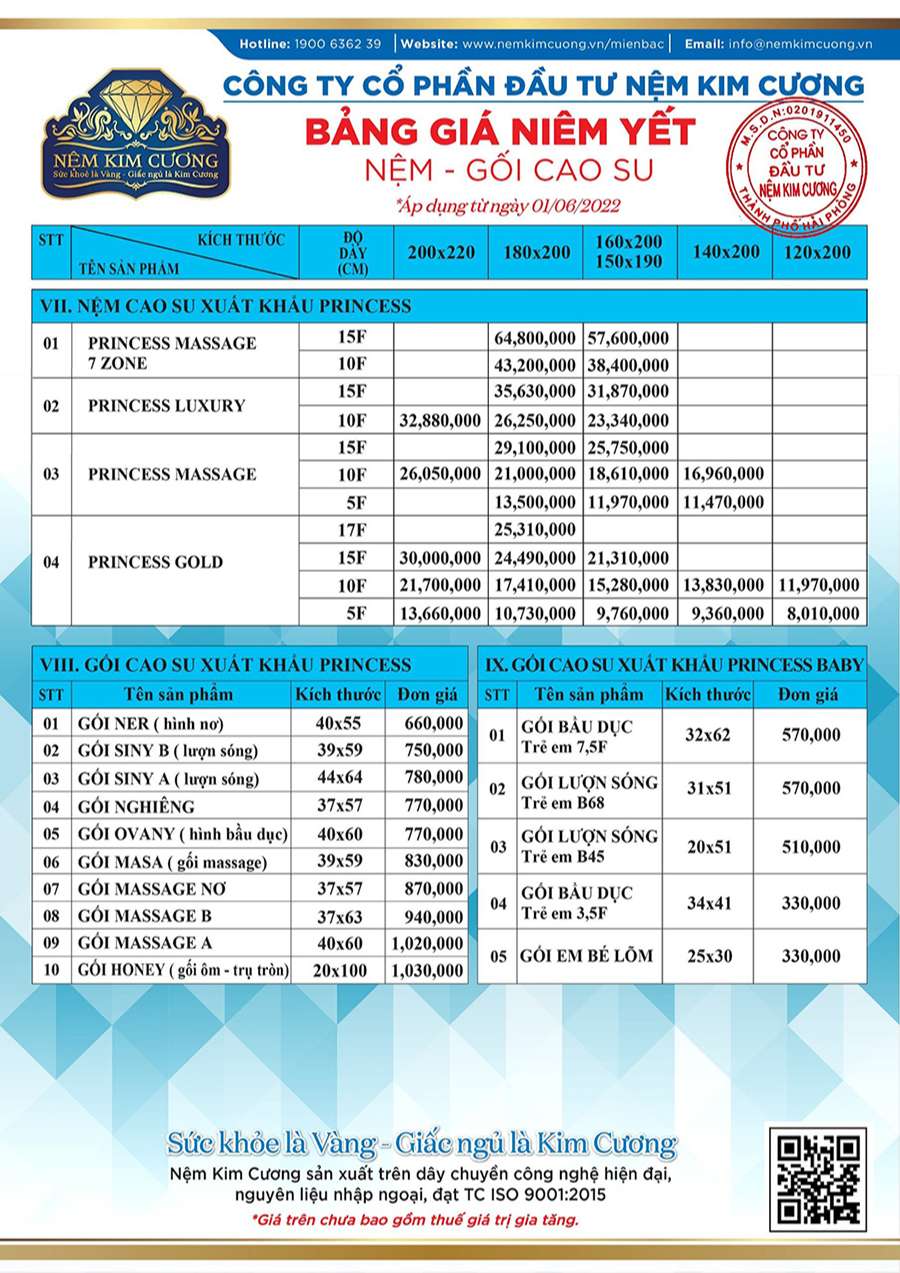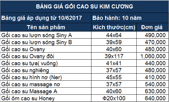 Về giá cả, gối cao su Kim Cương có mức giá dao động tùy theo kích thước và mẫu mã. Thông thường, giá gối cao su Kim Cương hiện nay nằm trong khoảng từ 600.000 đồng đến hơn 1 triệu đồng một chiếc, tùy loại và nơi bán. Một số mẫu gối cao su thiên nhiên cao cấp của Kim Cương còn có giá cao hơn nhưng đi kèm chất lượng và độ bền vượt trội.